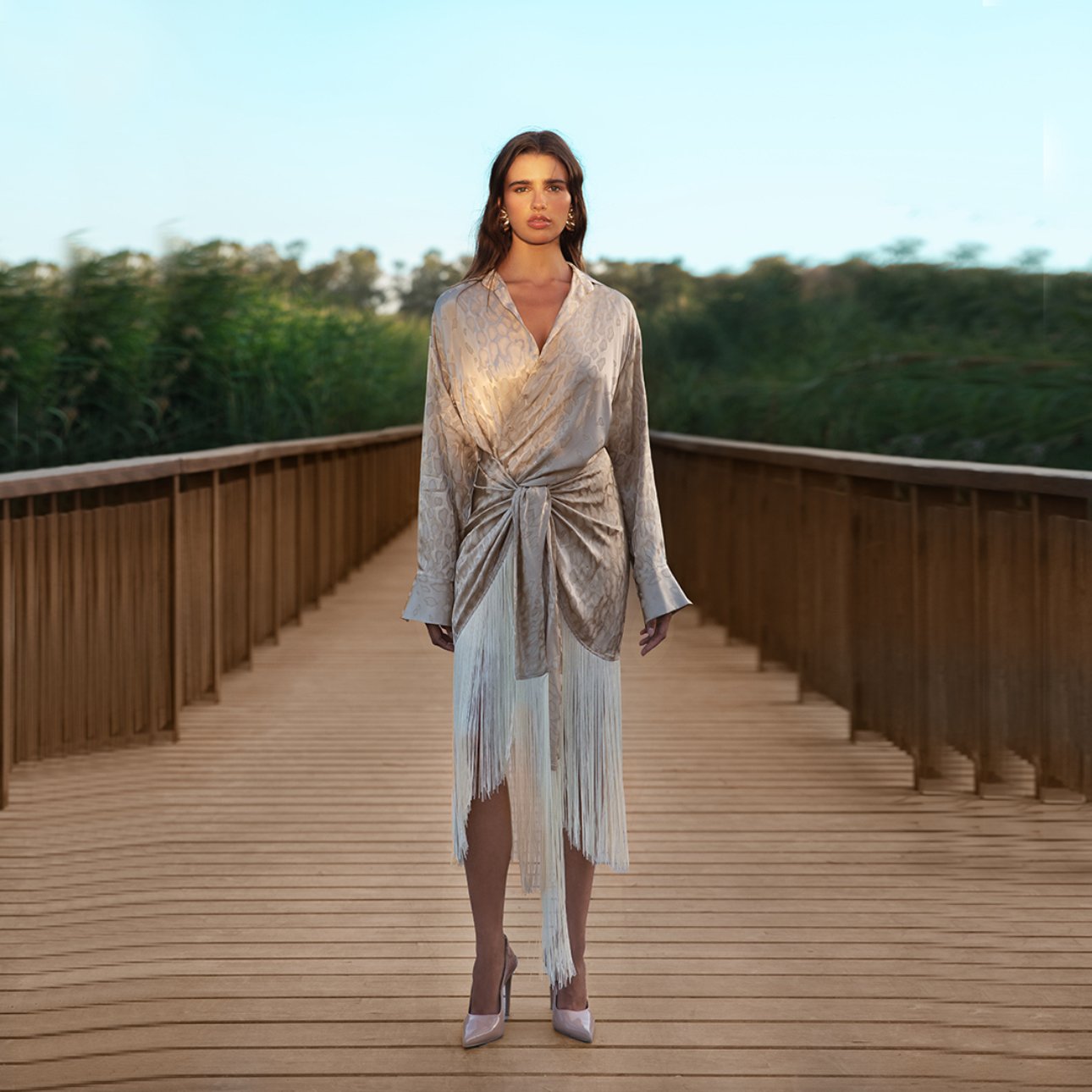 ALMA SANCHEZ – Enhance your style with this elegant midi shirt dress in a jacquard fabric, perfect for a sophisticated and contemporary look. Its structured design enhances the silhouette, while the fringes at the bottom add a touch of movement and originality.