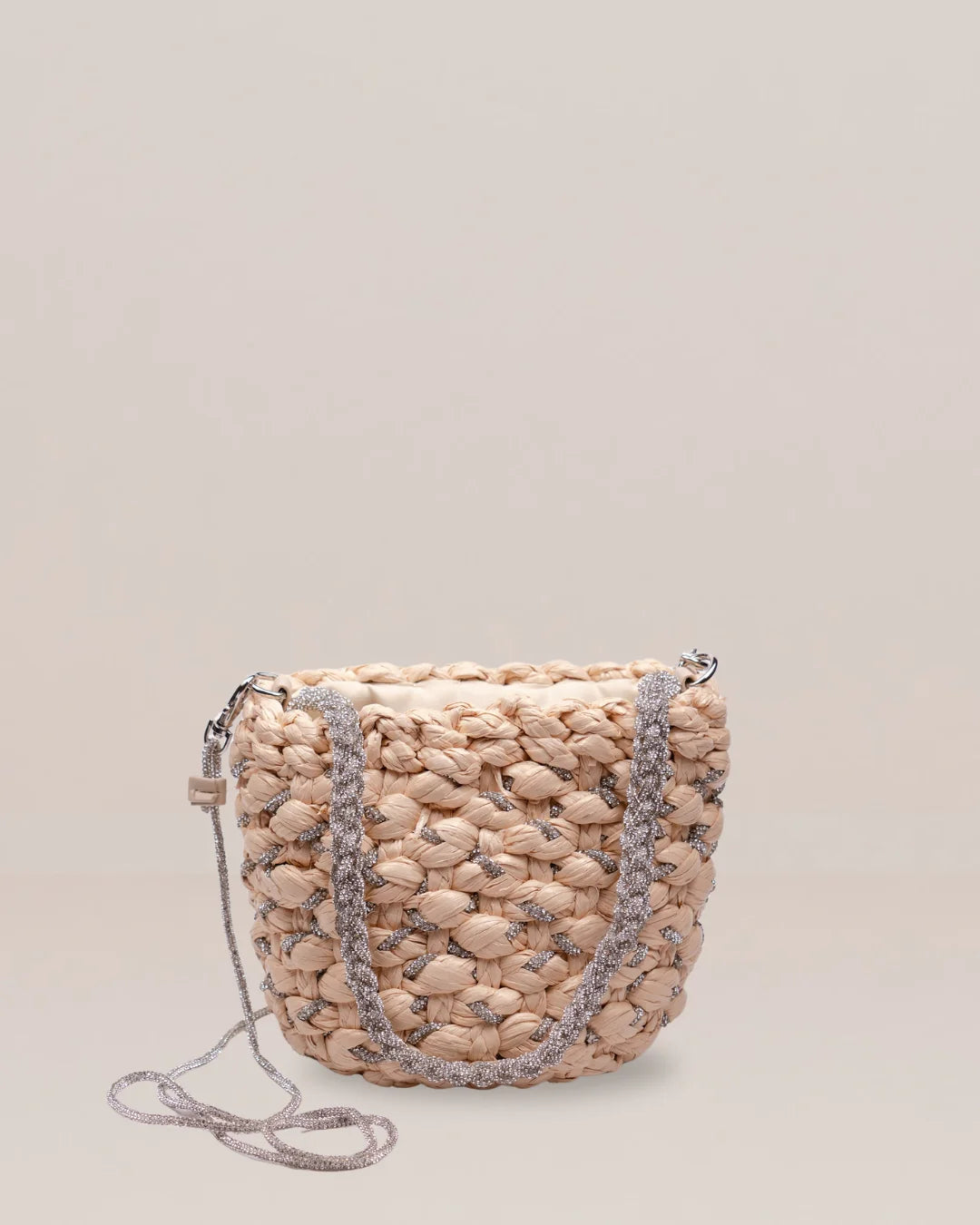 PHO Firenze - Hand-braided raffia forms a sculptural mini bucket silhouette, subtly interwoven with metallic threads for a refined shimmer. Finished with a soft fabric lining and a delicate shoulder strap, this bag balances natural texture with luminous accents. An effortless companion for summer days, island nights, and resort escapes.