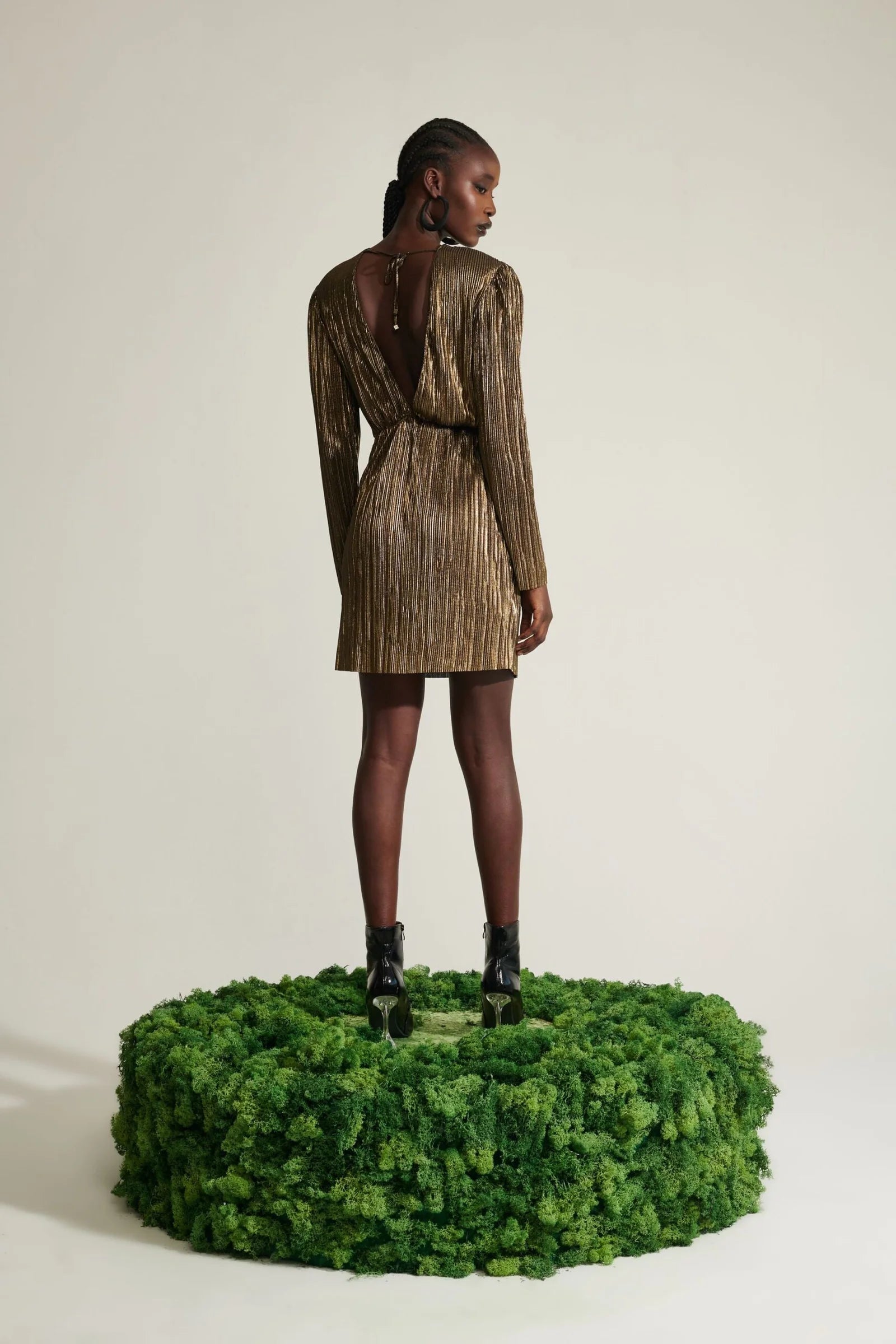 Le Sarte Del Sole - Radiate confidence in the Le Sarte Del Sole Bronze Open Back Mini Dress. Crafted to shimmer with every move, its open-back design embodies pure elegance and sensual sophistication.