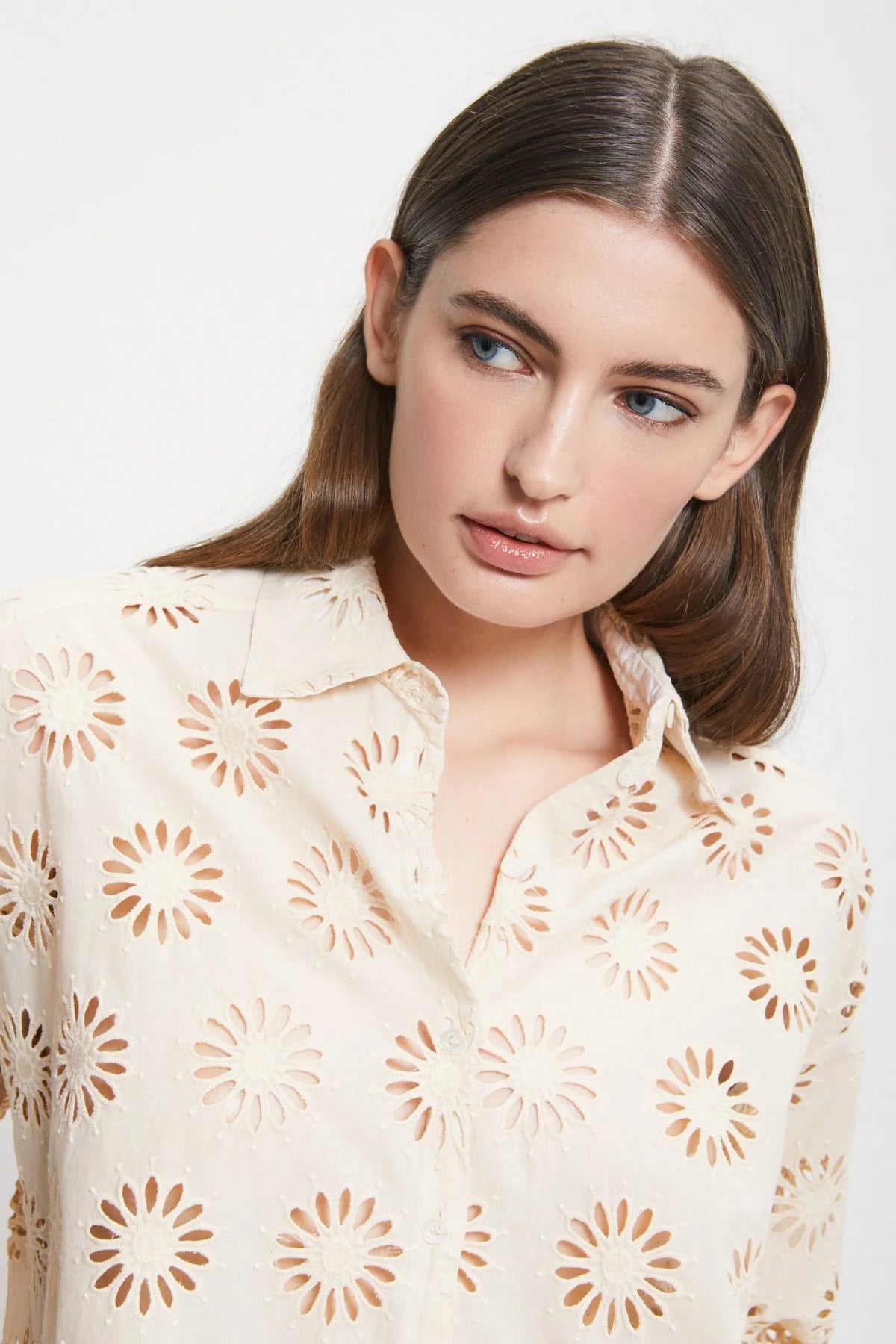 Ottod'Ame - A timeless shirt crafted from 100% cotton, featuring intricate cutwork embroidery that brings lightness and artisanal elegance to the silhouette. Designed with a relaxed fit for effortless styling, it’s perfect worn alone or paired with the matching pants for a refined summer set.
