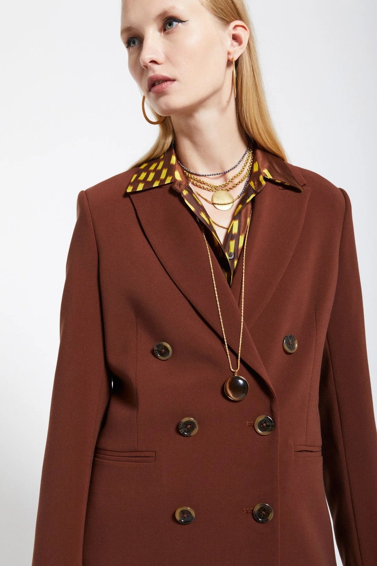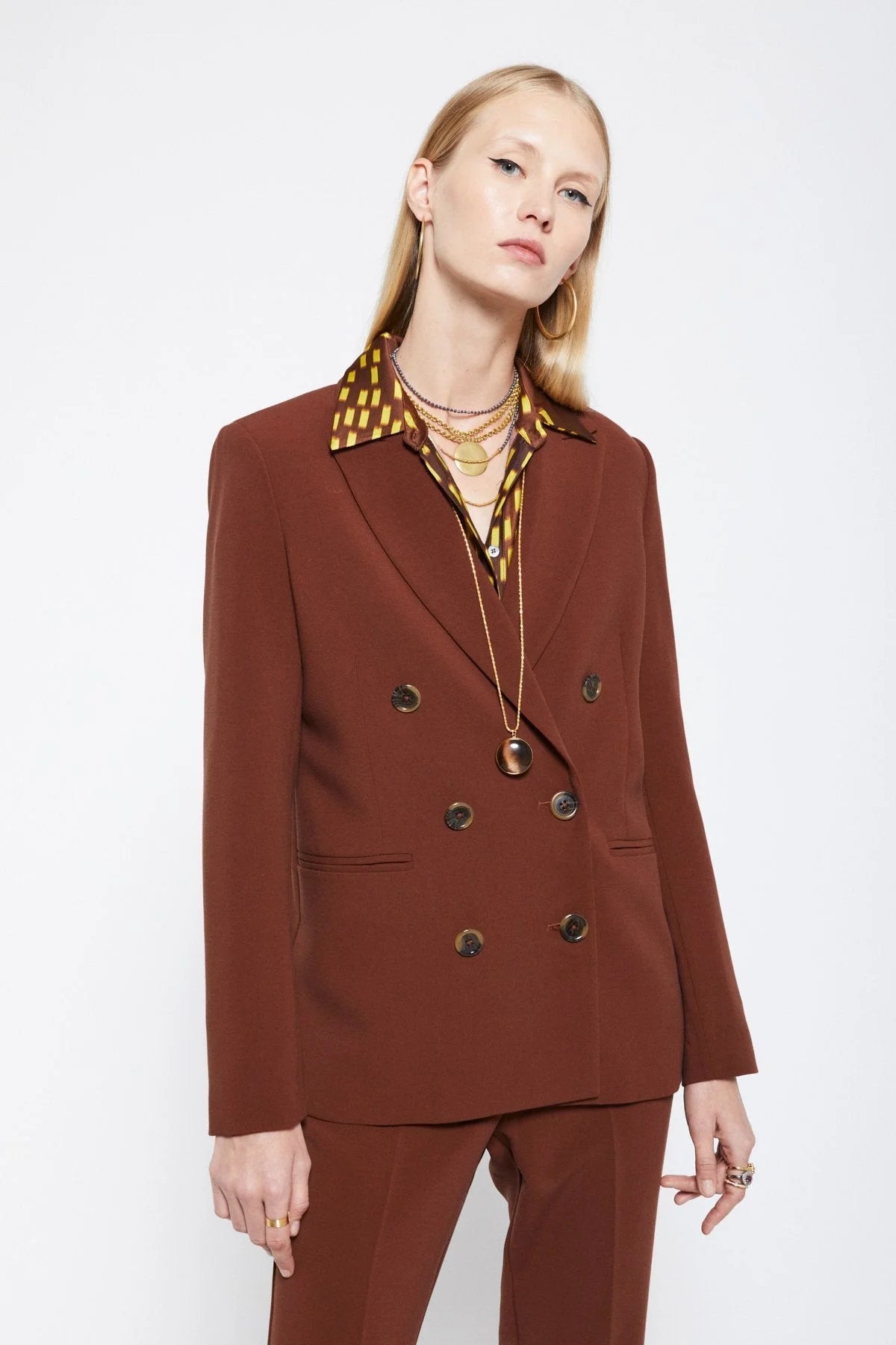 Sharp and sophisticated, this double-breasted blazer jacket pairs perfectly with our flared trousers. Tailored fit, timeless style, and effortless elegance.