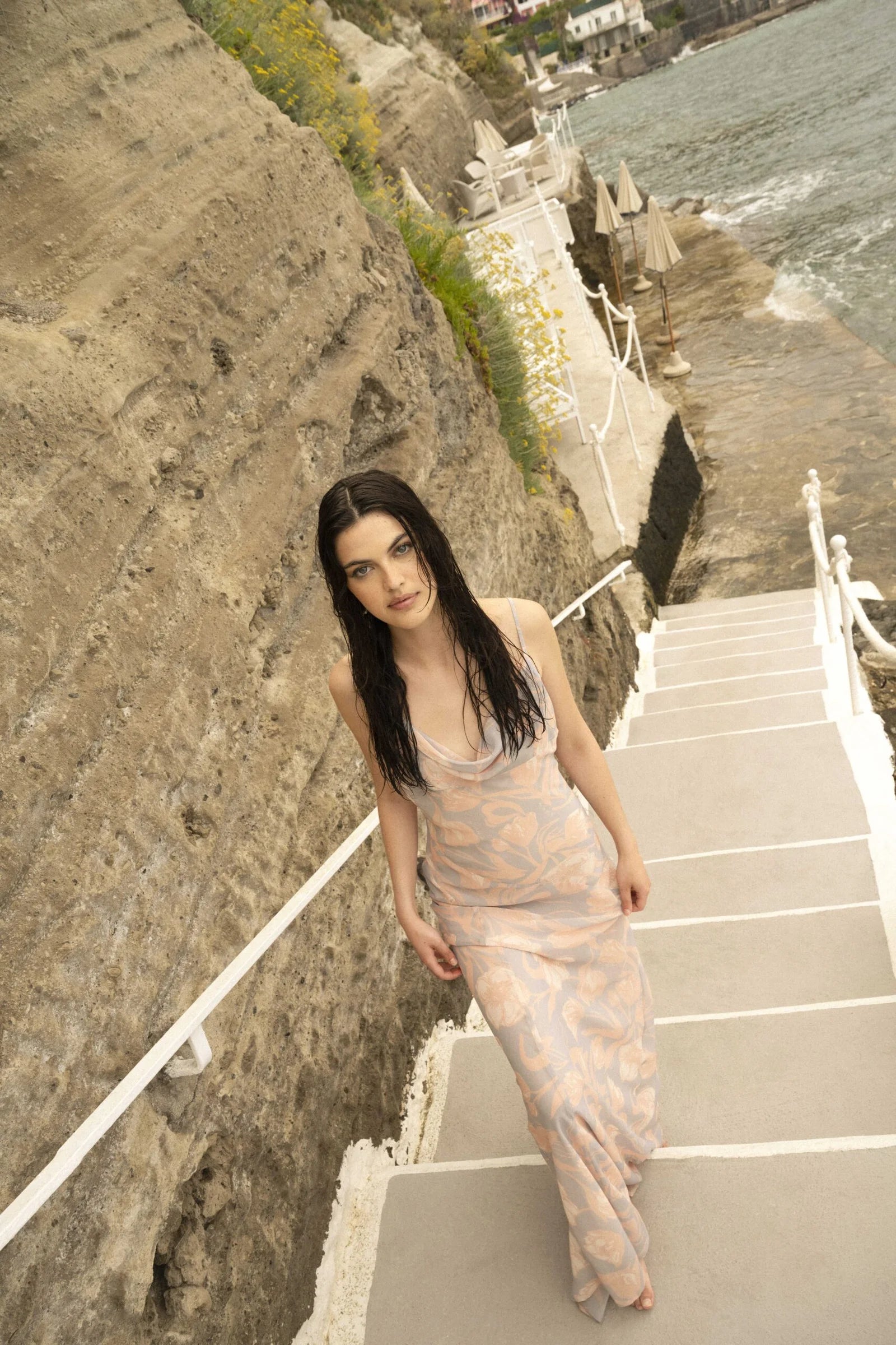 Le Sarte Del Sole - A fluid maxi dress in sheer nude tones with a delicate floral motif, designed with a low open back and fine straps that melt into the skin. Light, sensual, and effortlessly elegant, it’s made for seaside moments, golden light, and quiet confidence.