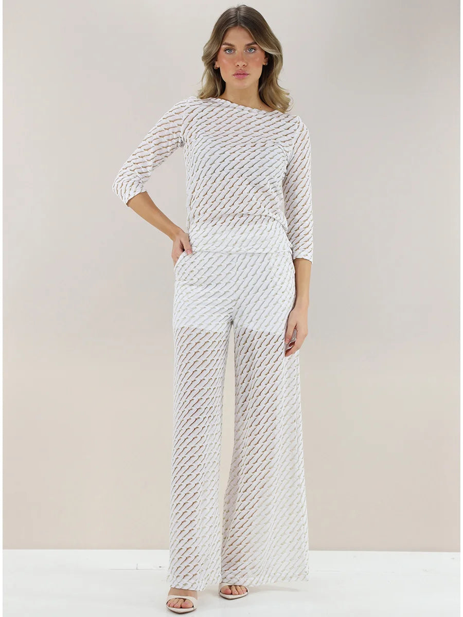 PHO Firenze - Elevated knit trousers with a wide-leg silhouette, crafted in a delicate open-knit weave with subtle golden shimmer. Lightweight, fluid, and effortlessly chic, designed to move beautifully from day to night. Perfect worn alone or styled as a set for a statement look.