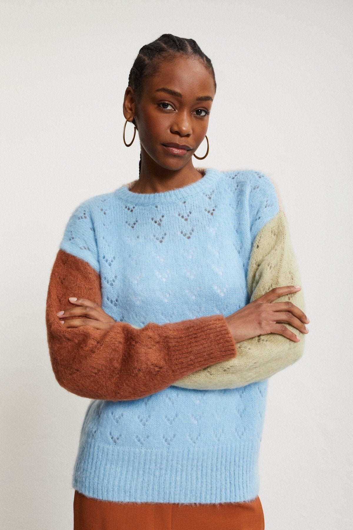 Ottod’Ame – Cozy and artistic, this mohair-blend jumper features stripes and patchwork-effect details for a unique, textured look. A stylish piece that blends comfort with sophisticated design.