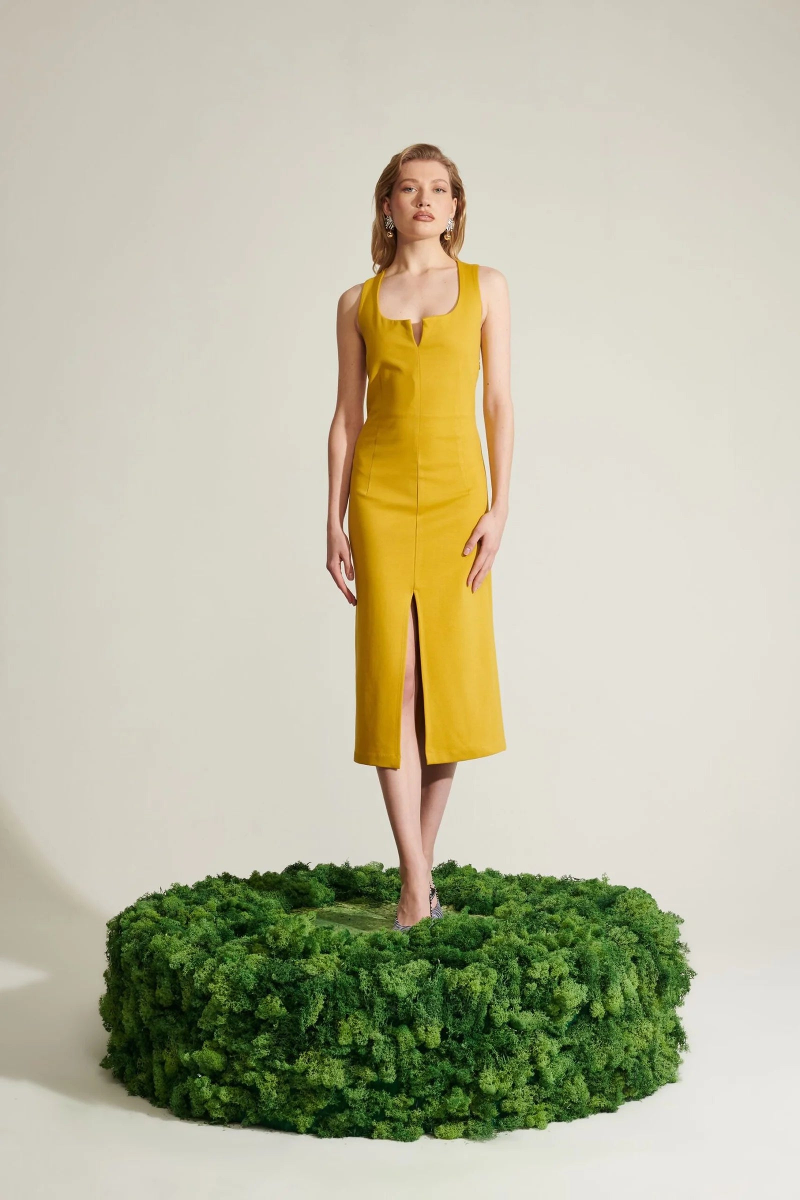 Le Sarte Del Sole - A sleek midi dress in a radiant golden hue, finished with a front slit for just the right flash of drama. Clean lines, sculpting fit, and effortless elegance that moves with you. Minimal from afar, unforgettable up close.