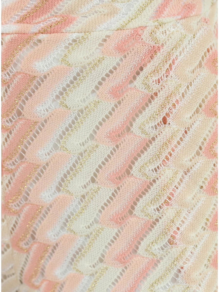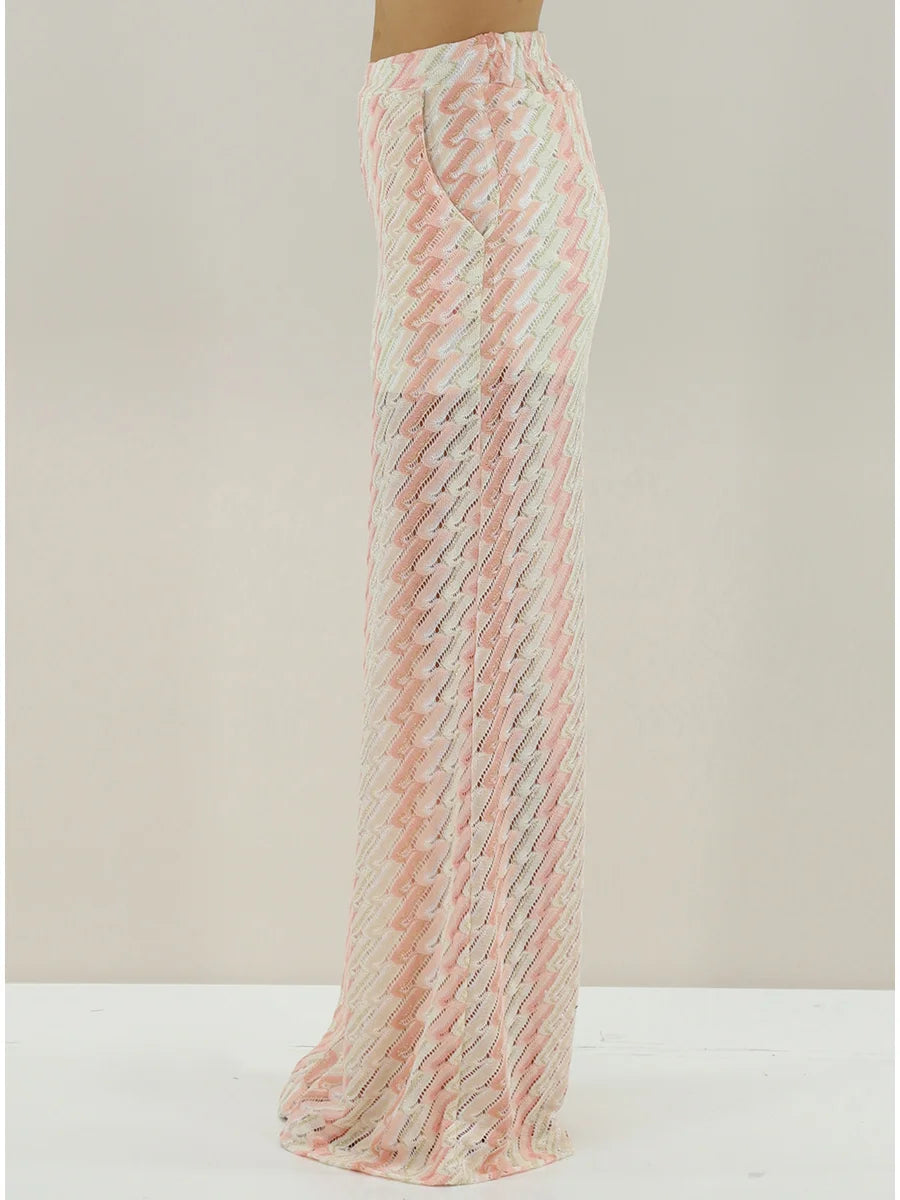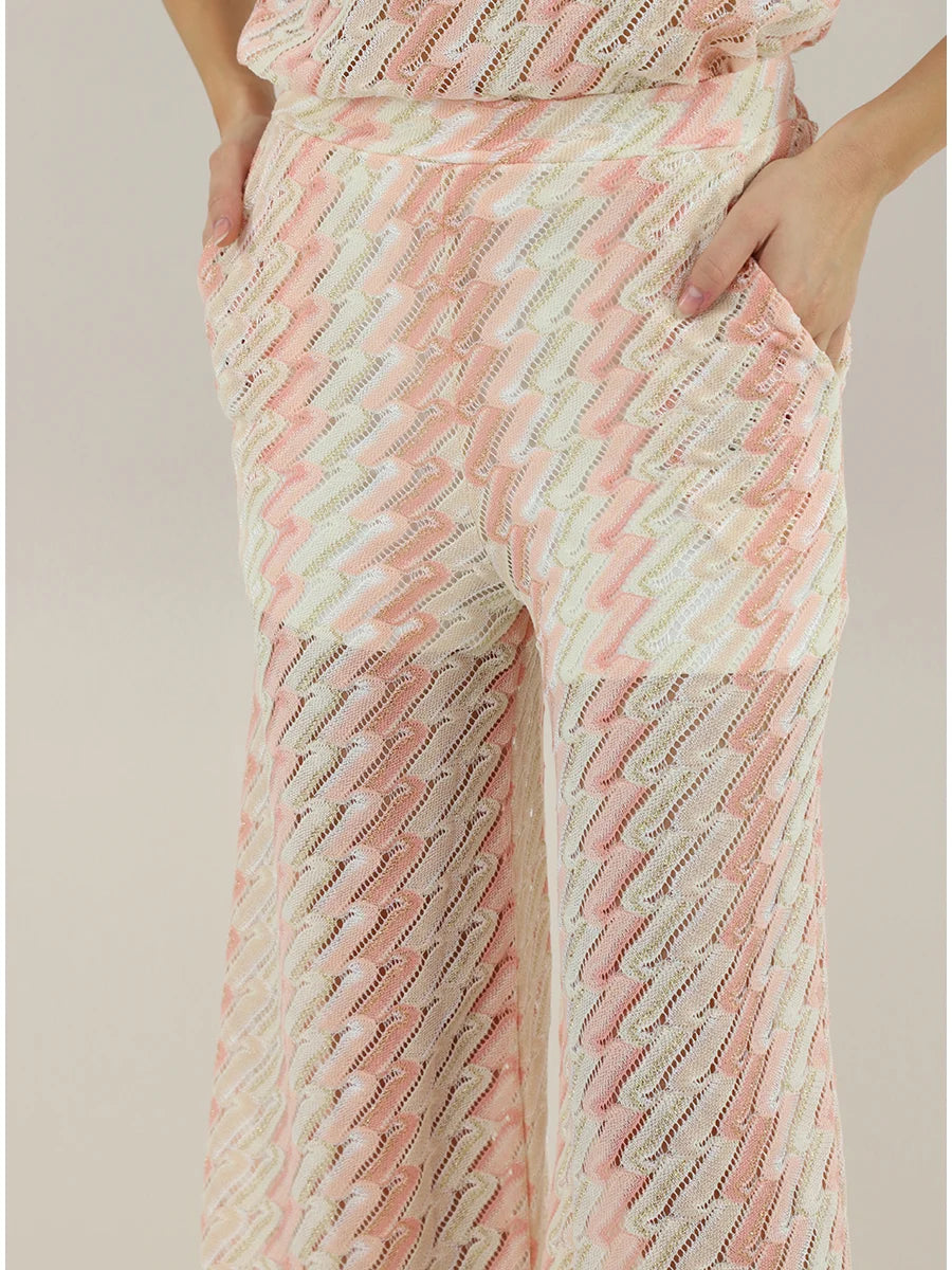 PHO Firenze - High-waisted knit pants crafted in a delicate zigzag open-weave with soft rosé and ivory tones. Featuring a relaxed, wide-leg silhouette and an elastic waistband for effortless comfort. Lightweight, semi-sheer, and irresistibly elegant, perfect styled with the matching top or worn as a statement summer piece.