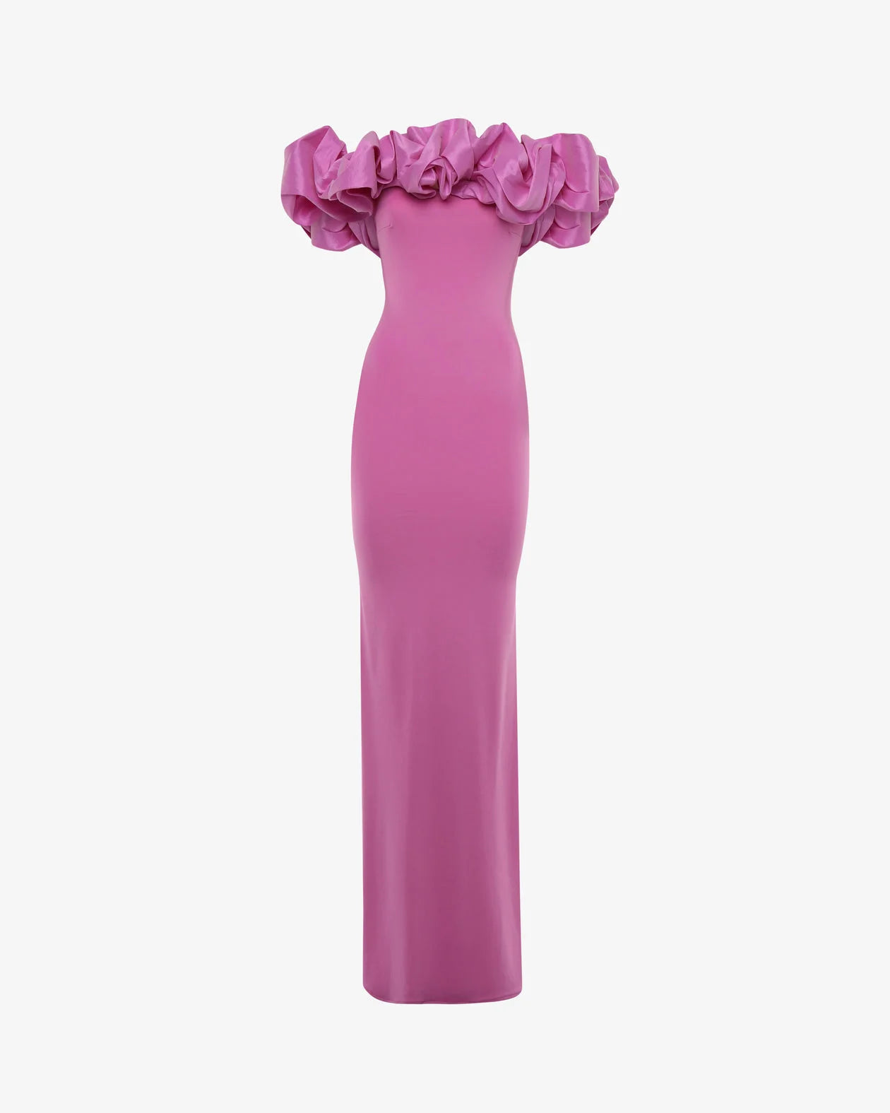 The touch of class is given by the removable taffeta shrug, which adds volume and a refined contrast of textures.