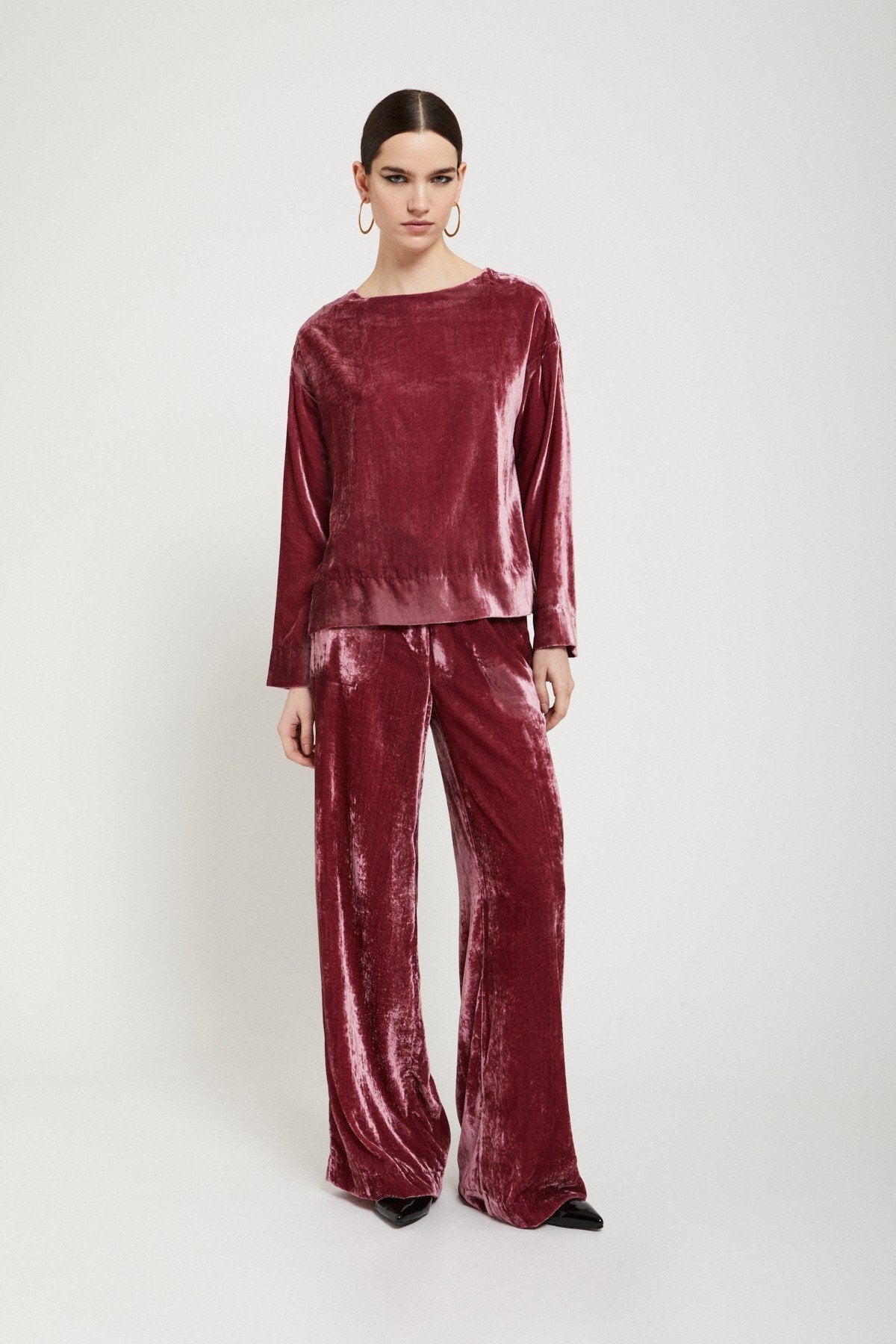 Ottod’Ame – Velvet palazzo trousers with pockets. Soft, fluid, and irresistibly elegant — these velvet palazzo trousers with pockets redefine modern luxury. A statement of comfort and sophistication for elevated day-to-night style.