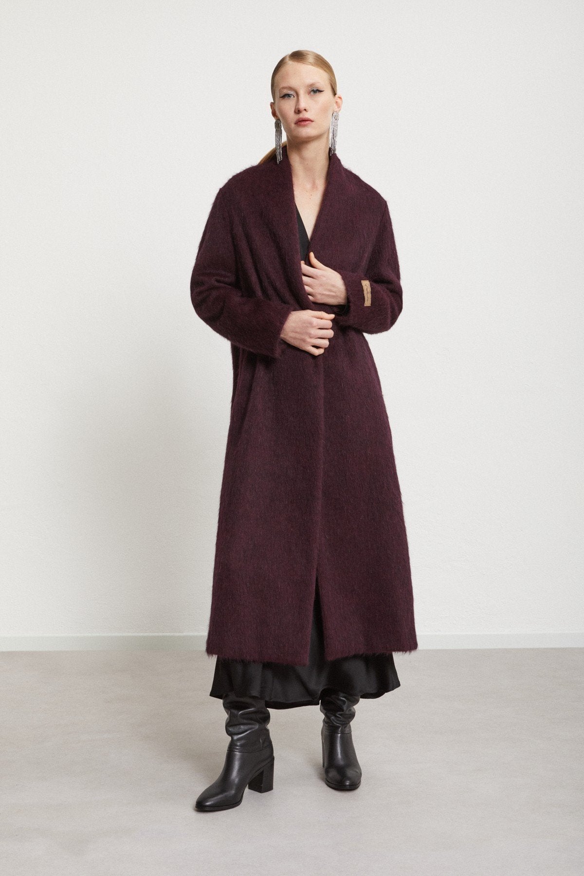 Ottod'Ame - Wrap yourself in warmth and sophistication with this wool-blend long coat crafted from alpaca and mohair. Finished with a single button and belt for a timeless, elegant silhouette.
